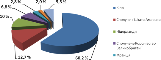 До п’ятірки основних країн-інвесторів, на які припадає більше 92% загального обсягу прямих інвестицій, входять Кіпр – 135,8 млн.дол.США (60,2% до загального підсумку), США – 28,5 млн.дол.США (12,7%), Нідерланди – 22,5 млн.дол.США (10,0%), Сполучене Королівство Великобританії – 15,4 млн.дол.США (6,8 %), Франція – 6,2 млн.дол.США (2,8%).