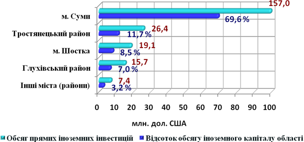 У регіональному розподілі іноземного капіталу зміни не відбувалися. На Сумщині провідні місця за обсягами прямих іноземних інвестицій продовжують займати міста Суми – 157,0 млн.дол.США (69,6% від загального обсягу) та Шостка – 19,1 млн.дол.США (8,5%), райони – Тростянецький –26,4 млн.дол.США (11,7%) та Глухівський – 15,7 млн.дол.США (7,0%).