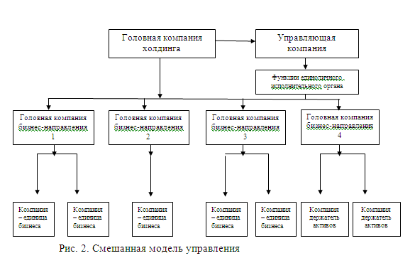 Применение института управляющей компании позволяет существенно сократить издержки на проведение реорганизации компании, поскольку данная модель принципиально не требует построения структуры, основанной на корпоративном владении акционерным капиталом. Тем не менее, на практике почти нет примеров организаций, использующих модель управляющей компании (управляющих компаний) в чистом виде – чаще всего внедряется смешанная модель управления (рис. 2), при которой управление дочерними обществами обеспечивается одновременно через участие в уставном капитале и привлечение управляющей компании, выполняющей функции единоличного исполнительного органа дочерних обществ.