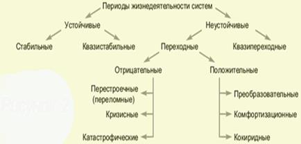 В результате жизнедеятельности систем происходит изменение тенденций их существования. Периоды изменения тенденций жизнедеятельности систем в результате исчерпания внутренних возможностей системы (потенциала системы) или же под воздействием внешних факторов являются переходными периодами или — в отдельных случаях — кризисами. В связи с этим необходимо опираться на классификацию переходных периодов.[3]