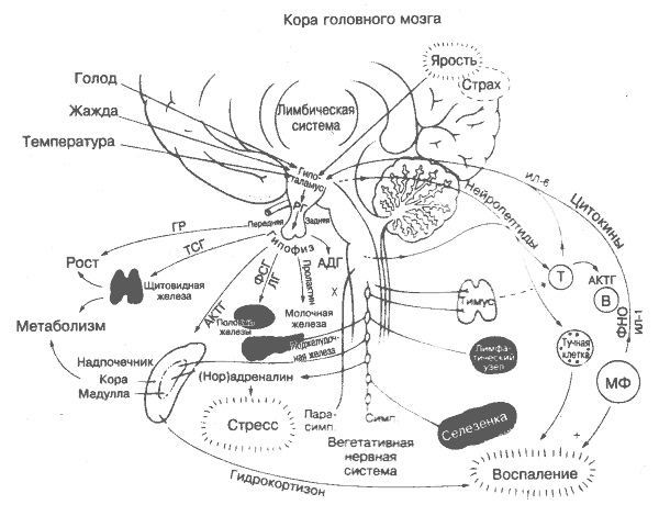 Дефицитарность функций иммунной системы может приводить к увеличению восприимчивости организма к инфекции или к беспрепятственному делению мутантных клеток и образованию злокачественных опухолей. Сверхактивная иммунная система зачастую оказывается неспособной к дифференцировке между клетками организма и чужеродными клетками и начинает атаковать себя, давая начало так называемым аутоиммунным болезням, примером которых служат ревматоидный артрит, гипертиреоз и волчанка. Появляется все больше доказательств, что как гипо-, так и гиперфункция иммунной системы, могут быть связаны с действием психосоциальных стрессоров и с избытком или недостатком определенных гормонов. Кроме того, регулирование деятельности иммунной системы обусловлено, отчасти, активностью нейропептидов, так как они состоят из цепочек аминокислот, обеспечивающих связи между нервной, эндокринной и иммунной системами. Нейропептиды секретируются головным мозгом, иммунной системой и нервными клетками др. органов. Области мозга, отвечающие за регулирование эмоциональных реакций, особенно богаты клеточными рецепторами этих хим. посредников. В то же время, головной мозг содержит клеточные рецепторы молекул белков, вырабатываемых только иммунной системой, в частности, лимфокинов и интерлейкинов. Это делает возможным устойчивую двухстороннюю систему связи между головным мозгом, иммунной системой и, возможно, всеми др. системами, обеспечивая канал для потенциального воздействия эмоциональных реакций на способность организма защищать себя. Роль нейропептидов настолько важна, что они были названы "дирижерами иммунного оркестра". Перт высказывает предположение, что чем больше мы будем узнавать о нейропептидах, тем больше у нас будет оснований употреблять термин "телоразум" (bodymind) вместо таких традиционных терминов, как "разум" (mind) и "тело" (body). Она добавляет, что по мере того как роль нейропептидов в организации информационных потоков становится все более очевидной, роль межклеточных синапсов уменьшается. Росси рассматривает эту концепцию информационного потока "как общий знаменатель, позволяющий нам преодолеть разрыв между разумом и материей, душой и телом в деле создания новой науки об исцелении души/тела".