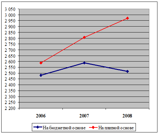 Из приведенных данных (рисунок 1) видно, что за период с 2008 года по 2010 год контингент университета вырос в 1,08 раза рост обусловлен, прежде всего, вводом новых специальностей, развитием материально-технической базы. Неуклонно растет интерес абитуриентов к заочной форме обучения (таблица 5).Также стабильная положительная динамика приема на очную форму обучения.