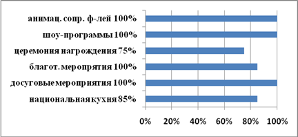 Наиболее понравившееся мероприятие, проводимое в рамках национального мероприятия Вашего города? Национальная кухня; Досуговые мероприятия; Благотворительные мероприятия; Церемония награждения; Шоу программы; Анимационное сопровождение фестивалей; другой ответ.