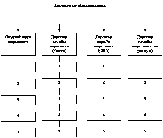 Рыночная структура построена на разделении службы маркетинга по отдельным рынкам в каждом интересующем регионе. При ее осуществлении управляющие отдельными региональными представительствами несут ответственность за разработку и реализацию стратегий и планов маркетинговой деятельности на определенных рынках. Они могут подчиняться непосредственно руководителю предприятия или начальнику службы маркетинга в ранге не ниже заместителя руководителя организации. Данная структура чаще всего встречается в организациях, продающих свою продукцию на разных рынках, где наблюдаются неодинаковые товарные предпочтения или продукция требует специфического обслуживания.