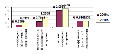 Кредиторская задолженность оборачивалась в 2009г. 19,61 раз за год, и к 2009г. показатель уменьшился до 18,92 оборотов за год. Период одного оборота соответственно в динамике увеличился с 18,61 дней в 2009г., 19,29 дней в 2010г. Это указывает на то, что хлебокомбинат стал рассчитываться со своими поставщиками медленнее, что является негативной тенденцией и может быть следствием снижения эффективности работы с дебиторской задолженностью.