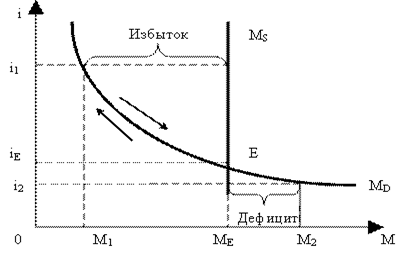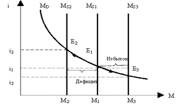 Равный заданному объему предложения спрос на деньги будет иметь место при ставке процента iE . Допустим, что процентная ставка по каким-то причинам оказалась выше равновесного уровня (i1>iE). Большая, чем равновесная, ставка означает увеличение альтернативной стоимости хранения денег. Спрос же на наличные и чековые деньги упадет до М1 (движение по кривой). Свои финансовые средства станет выгоднее держать в альтернативных финансовых активах (в облигациях, векселях, срочных депозитах и т.п.). Возникает излишек наличных и чековых денег, от которого люди попытаются избавиться. С одной стороны, увеличится спрос на облигации BD (bond - облигации) и превысит их достаточно стабильное предложение ВS. С другой - станут более привлекательными срочные вклады. Избыток спроса на облигации вызовет повышение их курсовой стоимости и снижение процента реальной доходности. В свою очередь, наплыв "излишних" денег во вклады сделает их менее привлекательными для тех, кто аккумулирует деньги. Это будет подталкивать последних к снижению процентных ставок по срочным депозитам. Снижение процентной ставки уменьшит привлекательность депозитов для вкладчиков. Одновременное падение доходности облигаций уменьшит спрос и на них. В результате увеличится спрос на наличные деньги, облигации начнут активно продавать, а срочные депозиты переводить в текущие. Все это будет продолжаться до тех пор, пока спрос и предложение денег не уравновесятся на исходном уровне процентной ставки.
