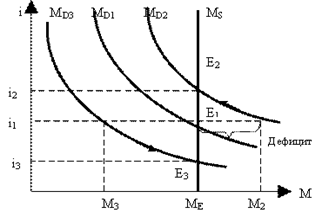 Как бы то ни было, во всех трех описанных ситуациях произойдет сдвиг кривой спроса на деньги вправо или влево (рис.5). При исходной равновесной ставке i1 возникает недостаток (М3) или избыток (М2) спроса на деньги. Описанный выше механизм колебаний процентной ставки установит равновесие на денежном рынке на новом уровне i2 или i3. Аналогичные процессы произойдут и при сдвиге кривой предложения денег (рис.4).