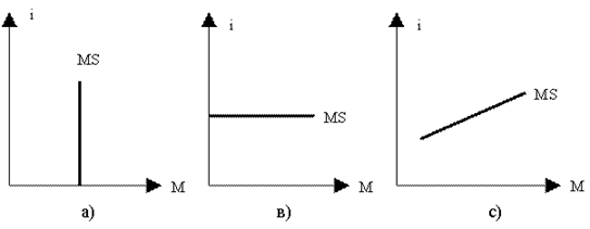 Рисунок 2 - Предложение денег при жесткой (а), гибкой (в) и промежуточной (с) монетарной политике.
