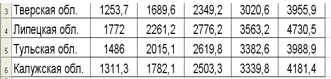 1. За данный период денежные доходы в Тверской обл. возросли на 2702,2 руб., в Липецкой обл. на 2658,2 руб., В Тульской обл. на 2502,9 руб. и в Калужской обл. на 2870,1 руб.