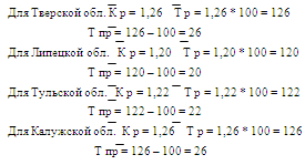 2. Положительный темп прироста свидетельствует о ежегодном увеличении денежных доходов: в Тверской области на 26 %, в Липецкой области на 20 %, В Тульской области на 22 % и в Калужской области на 26%.
