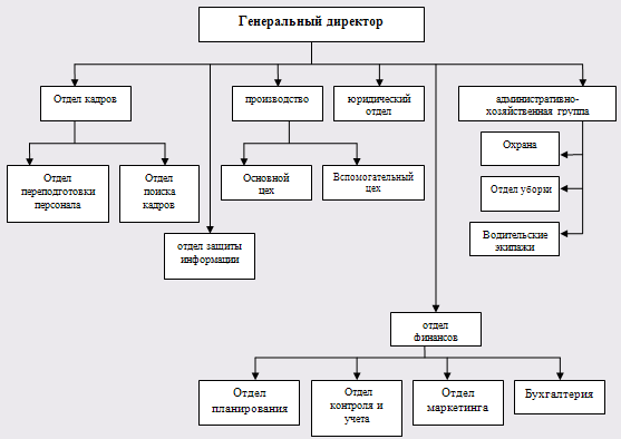 Деятельность отелов и служб на предприятии сформирована по принципу линейной структуры управления. При такой структуре управления всю полноту власти берет на себя линейный руководитель – директор предприятия, возглавляющий коллектив. При разработке конкретных вопросов и подготовке соответствующих решений, программ, планов ему помогает специальный аппарат, состоящий из функциональных подразделений. В прямом подчинении у руководителя предприятия находятся шесть специализированных структурных подразделения: