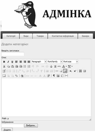 Створити адміністративну частину сайту, в якій адміністратор або власник сайту зможе добавляти, редагувати, і видаляти категорії товарів, товари, банери, реклами , статті та ін.