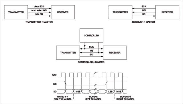 Шина использует для связи две служебные линии тактирования «Serial Clock» (SCK) и выбора канала «Word Select» (WS) и одну линию данных «Serial Data» (SD). Наличие линии тактирования SCK обусловлено синхронной природой интерфейса, а вот наличие линии выбора канала WS напрямую связанно с его звуковым применением. Переключая состояние данной линии, ведущее устройство указывает на передачу данных из разных каналов стерео аудиопотока: WS = 0 – левый канал, WS = 1 – правый. Кстати спецификация предусматривает, что ведущим устройством может быть как сам передатчик, так и приемник или даже третье устройство-арбитр. При этом основной задачей ведущего является генерация сигналов на служебных линиях SCK и WS (рис. 2 [2]).