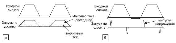 Рис. 2. Различные методы декодирования сигнала: а) схема передачи сигнала с запуском по уровню; б) схема передачи сигнала с запуском по фронту