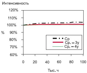 Рис. 4. Снижение интенсивности излучения светодиода при токе 3 мА, температуре 85 °C и постоянно включенном светодиоде