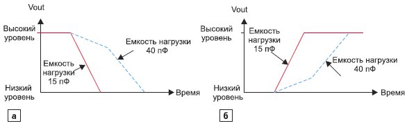 Рис. 5. Изменение времени нарастания и спада выходного сигнала в зависимости от емкости нагрузки: а) уровень на выходе меняется с высокого на низкий; б) уровень на выходе меняется с низкого на высокий