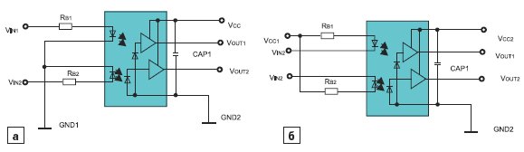 Рис. 6. Управление полярностью входа оптрона позволяет выбирать инвертирующую или неинвертирующую логику работы: а) ACPL-064L в инвертирующей логике; б) ACPL-064L в неинвертирующей логике