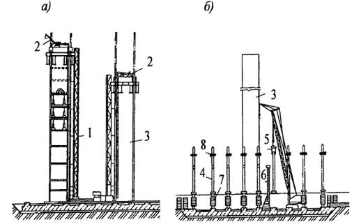 Рис.1. Бетонирование ядра жесткости и монтаж колонн первого яруса: а —возведение ядра жесткости; б—монтаж колонн; 1 — грузопассажирский подъемник; 2 — опалубка ядра жесткости; 3 — ядро жесткости; 4 — колонна первого яруса; 5 — строповка колонны; 6 — монтажные подмости; 7 — комплект воротников на колонне; 8 — домкраты для подъема плит