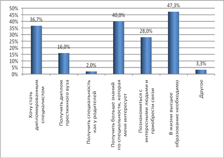 Период обучения в вузе и получение высшего образования является не только определенной вехой в жизни каждого человека, но и одним из важных этапов социализации личности, способствующих формированию ее мировоззрения. Мотивация получения высшего образования занимает ведущее место в структуре личности; посредством именно этого понятия объясняются движущие силы поведения человека.