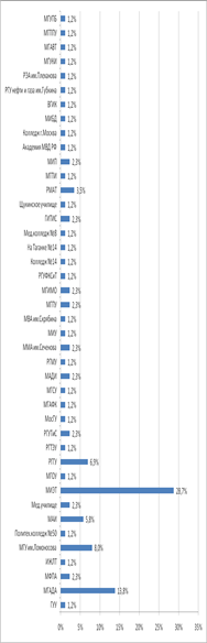 · Большинство респондентов выбрали для поступления МИЭТ и МГАДА, что отвечает критериям наличия интересной специальности, государственной аккредитации, возможности бесплатного обучения;