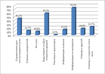 · Интернет, справочники для поступающих в ВУЗы, Дни открытых дверей – наиболее популярные источники информации для абитуриентов, на качество и полноту информации в которых учебным заведениям стоит обратить более пристальное внимание с целью обеспечения максимальной осведомленности абитуриентов;