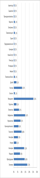 · Большинство респондентов хотели бы обучаться в таких областях знаний, как менеджмент, экономика, информатика, юриспруденция, несмотря на то, что в настоящее время наблюдается избыток в данных специалистах.