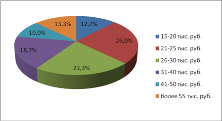 | 12. 7% - 15-20 тыс. рублей, 18% абитуриентов ожидают зарабатывать 21-25 тыс. рублей в течение 1-2 лет после окончания вуза, 43% - 26-30 тыс. рублей, 8% - 31-40 тыс. рублей, 7% - 41-50 тыс. рублей, 17% - более 55 тыс. рублей |
