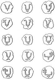 Найдены в раскопках на российских городищах остатки гончарных изделий, помеченных на днище клеймами мастеров. Среди знаков - круг, крест в круге, ключ, звезда, квадрат. Исследователи сфрагистики (науки о печатях) установили: чем ниже ранг пользователя пометами, тем клейма лаконичнее, проще. Иногда это просто зигзаг или острый угол. С повышением ранга владельческие знаки, как правило, усложняются. Для великокняжеских печатей домонгольского периода это уже нередко - лики святых и тезоименинных покровителей. Об одной из самых древних сохранившихся на Руси княжеских печатей сообщает Н. Карамзин в "Истории государства Российского": такова серебряная с позолотой печать, привешенная к жалованной грамоте князя Мстислава Владимировича. С одной стороны печати - лик Иисуса Христа, с другой - архангел Михаил, поражающий змея.