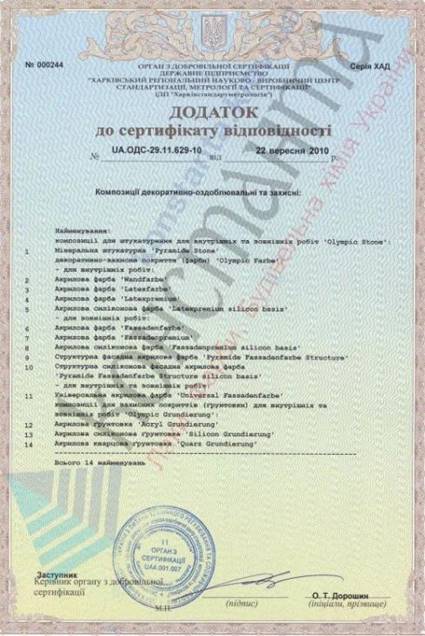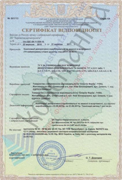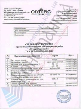 Після проведення органолептичної та фізико-хімічної ідентифікації і визначення відповідності випробувальної продукції (водо дисперсійної фарби), заявнику видається сертифікат відповідності даного зразка: