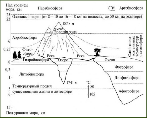 Все экосистемы Земли являются только структурными подразделениями, составными частями единой гигантской экосистемы, охватывающей всю поверхность планеты. Эту глобальную экосистему называют биосферой. Термин «биосфера» ввёл в 1875 г. Э. Зюсс, понимавший её как тонкую плёнку жизни на земной поверхности в значительной мере определяющей лик Земли. Учение о биосфере создано в 1926 г. русским геохимиком В. И. Вернадским (1863-1945). Он впервые оценил масштабы влияния жизни на физическую природу. Биосфера, по В. И. Вернадскому, - это общепланетарная оболочка, та область Земли, где существует или существовала жизнь и которая подвергается или подвергалась ее воздействию. Биосфера охватывает всю поверхность суши, моря и океаны, а также ту часть недр Земли, где находятся породы, созданные деятельностью живых организмов. В атмосфере верхние границы жизни определяются озоновым экраном - тонким слоем газа озона на высоте 16—20 км. Он задерживает губительные ультрафиолетовые лучи солнца. Океан насыщен жизнью целиком, до дна самых глубоких впадин в 10-11 км. В глубину твердой части Земли активная жизнь проникает местами до 3 км (бактерии в нефтяных месторождениях). Результаты жизнедеятельности организмов в виде осадочных пород прослеживаются еще глубже. Размножение, рост, обмен веществ и активность живых организмов за миллиарды лет полностью преобразовали эту часть нашей планеты. Всю массу организмов всех видов В. И. Вернадский назвал живым веществом Земли. В химический состав живого вещества входят те же самые атомы, которые составляют неживую природу, но в ином соотношении. В ходе обмена веществ живые существа постоянно перераспределяют химические элементы в природе. За счет фотосинтеза накоплен кислород атмосферы. За счет кислорода возник озоновый экран. Молекулы этого газа состоят из трех атомов кислорода и образуются при действии на молекулярный кислород ультрафиолетовых лучей. Таким образом, жизнь сама создала защитный слой в атмосфере, задерживающий большинство этих лучей.