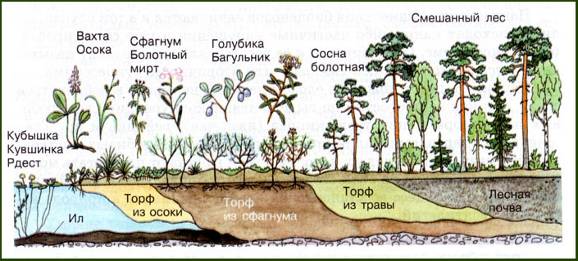 Таким образом, в природе происходит развитие экосистем от неустойчивого состояния к устойчивому. Этот процесс называют сукцессией. Например, зарастание небольших озер можно проследить на протяжении одного или нескольких поколений людей (рис. 2).