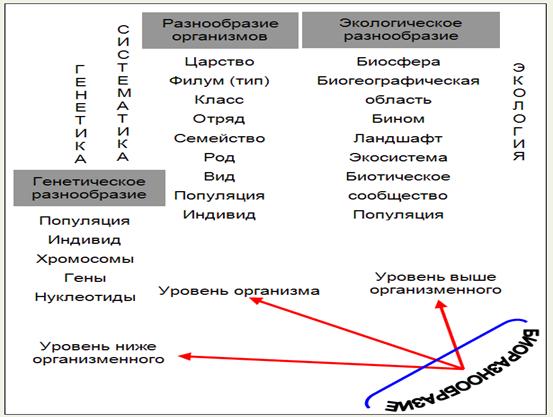 Каждая ветвь, подразделяемая на уровни, обладающие своими особенностями: ниже организменного, организменного и выше организменного и составляющие предмет изучения таких биологических наук, как генетика, систематика и экология. Биологическое разнообразие представляет собой уникальную особенность живой природы. Именно благодаря ему создается структурно-функциональная организация экологических систем, обеспечивающая их стабильность во времени и устойчивость к изменениям среды, в том числе и в результате антропогенных воздействий поддержание экосистем в устойчивом состоянии одна из первостепенных задач человечества. Поэтому основным понятиям, связанным с сохранением и использованием биоразнообразия, дано правовое толкование в законах Российской Федерации «Об охране окружающей среды», «Об особо охраняемых территориях» и других правовых документах.