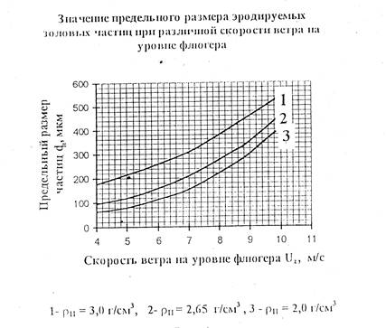 В методике учтено влияние гранулометрического состава отложений на пылящие свойства слоя. Наибольшая сдуваемость отмечается для слоя с преобладанием частиц 0,05-0,2 мм. Зола, сдуваемая с поверхности золоотвала и выносимая за его пределы, – полидисперсна, включает пылевые частицы от субмикронных до 500 мкм (витающие – размером до 40 мкм и гравитирующие, которые участвуют в сальтирующем движении – размером до 500 мкм). Витающие частицы следуют за ветровым потоком и рассеиваются на значительном удалении от золоотвала, сальтирующие же частицы перемещаются скачкообразно и на малые расстояния. Поэтому основную роль в загрязнении атмосферного воздуха за пределами СЗЗ золоотвала играют витающие частицы. Так как в зоне расположения золоотвала преобладают юго-западные ветра, то расчет приземной концентрации пылевых частиц проводится для северо-восточной дамбы, с которой будет ожидаться наибольший вынос пыли.