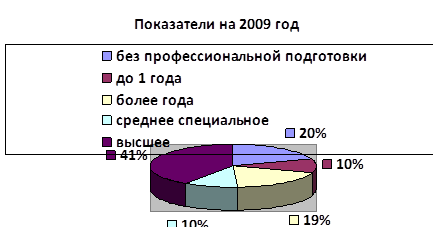 Из приведенных данных видно, что категория сотрудников, чья профессиональная подготовка более года, за отчетный период заметно изменилась, идет тенденция на понижение с 27 % до 22 %, а категория работников, профессиональная подготовка которых базируется на высшем образовании, возросла на 7 % и составила 27 % от общего числа работающих. Это говорит о том, что работники повышают свою профессиональную подготовку, переходя из одной категории в другую. В остальных категориях происходят незначительные колебания.