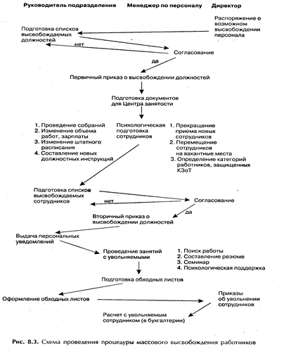6. Другие отдельные мероприятия: а)денежные компенсации при добровольном уходе с фирмы, б) досрочный выход на пенсию, в) метод «аутплэйсмент» (организация активно старается эмоционально облегчить сотруднику процесс разрыва с ней и помочь в поиске нового места работы путем выдачи рекомендаций, разрешения пользоваться фирменными компьютерами, факсами и телефонами для поиска работы и т. п.), увольнение отдельных сотрудников по признаку большей нерадивости, меньшей отдачи для фирмы.