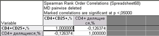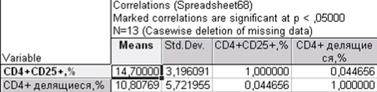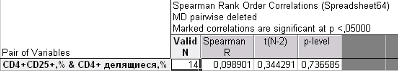 Принята нулевая гипотеза: Процентное содержание пролиферирующих (делящихся) клеток не связано с процентным содержанием CD25-позитивных CD4+ лимфоцитов.