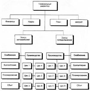 Дивизиональная структура характеризуется расширением функциональных служб. Расширение идет как по вертикали (службы организации, отделения), так и по горизонтали (у каждых блоков свои службы). На верхнем уровне иерархии сосредоточены в основном стратегическое управление, общая координация. Множество остальных функций, особенно оперативных, находятся в компетенции руководства отделений. Формируется многоуровневая структура. Тем самым высшее руководство отдаляется не только от рядовых сотрудников, но и от руководителей, как низшего, так и среднего звена. Преимущественное развитие получают вертикальные связи. Горизонтальные, наоборот, могут быть ослаблены (рис. 5).