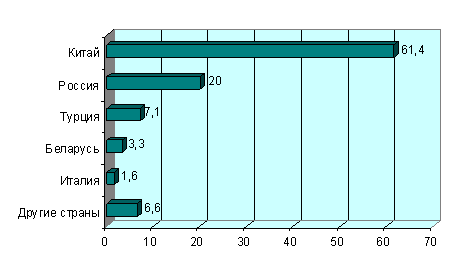 Крупнейшим в мире экспортером и основным поставщиком обуви в Россию является Китай. Несмотря на снижение его доли на российском рынке, присутствие обуви китайских производителей еще достаточно велико и составляет около 60%.