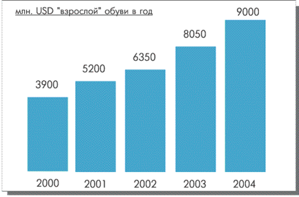 Рынок обуви в России не полностью насыщен и перспективен для инвестиций. На российском рынке обуви доминирует импортная продукция, а доля отечественных производителей в общем объеме рынка обуви незначительна и составляет около 14,5%.