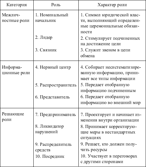 Касаясь содержания работы менеджера, Минцберг находит важную общую черту управленческой работы — роли руководителя. Роль, по его определению, является «набором определенных поведенческих правил, соответствующих конкретному учреждению или конкретной должности». Точно так же, как герои в пьесе имеют свои роли, которые заставляют их вести себя определенным образом, менеджеры занимают определенные должности в качестве руководителей определенных организационных подразделений и именно это определяет их служебное поведение. «Отдельная личность может влиять на характер исполнения роли, но не на ее содержание. Так актеры, менеджеры и другие играют заранее предопределенные роли, хотя как личности могут давать собственную интерпретацию этих ролей»[8, с.211].
