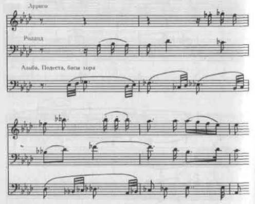 чрезвычайно выразительная в своей образной характерности, придает ему значение темы рока. Контрастная полифония великолепно выполняет свою роль, объединив собою сложные разнородные элементы, вытекающие из сюжетной коллизии: (см. рис.7)