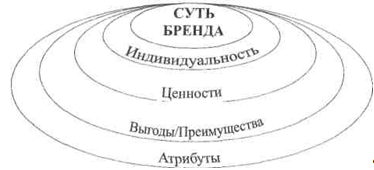 - существует уникальная модель построения бренда – "колесо бренда". В соответствии с данной моделью бренд можно представить в виде набора окружностей, каждая из которых представляет отдельный элемент бренда: атрибуты, выгоды и преимущества, ценности, индивидуальность (персоналия), суть бренда.