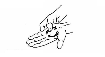 Применяют следующие варианты растирания: «щипцы», образованные большим и указательным пальцами; кругообразное подушечкой большого пальца (при этом большой палец растирает тыл, а указательный - ладонную поверхность пальца); прямолинейное подушечкой большого пальца; концентрическое всеми пальцами.