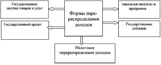 Перераспределение доходов — это изъятие части дохода у одних лиц с целью их передачи другим лицам или добровольная передача доходов одними лицами другим, более в них нуждающимся. Перераспределение доходов осуществляется государством и является характерной чертой социальной рыночной экономики. Существуют различные формы перераспределения доходов, некоторые из которых показаны на рисунке 3.