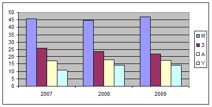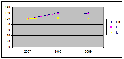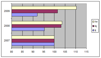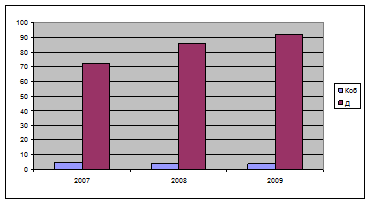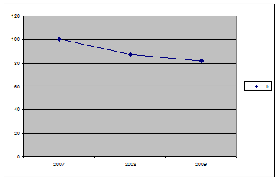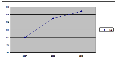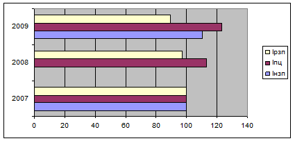 Анализируя полученные данные мы можем рассматривать частные уровни эффективности текущих затрат как факторы, влияющие на рост или снижение общей затратоемкость производства. В нашем случае общий уровень затратоёмкости растет, что означает снижение эффективности производства в 2009 году по сравнению с 2007 годом. На повышение общей затратоемкость особенно влияет увеличение материалоемкости и услугоемкости. Наибольшее абсолютное изменение уровня эффективности затрат дают эти показатели (перерасход). Эффективность затрат понижающую общую затратоемкость, дают затраты на оплату труда. По всем остальным элементам затрат есть резервы для снижения затратоемкости.
