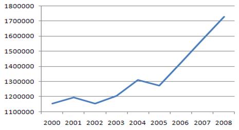 Рис. 3.3.1. Производство автомобилей в России в 2000–2008 гг.