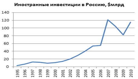 Рис. 3.3.3. Объем иностранных инвестиций в российскую экономику в 1995–2010 гг.