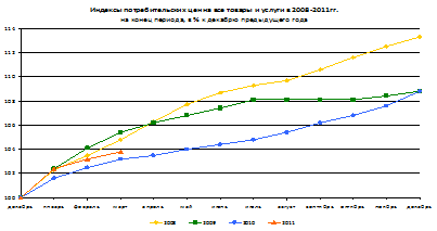 Далее обратимся к данным статистики и проанализируем развитие российской экономики, используя показатели инфляции за 2008 – 2011 гг.