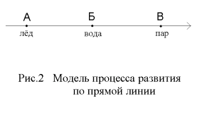 Точка зрения, противоположная кольцевой теории, утверждала, что, если не возникает ничего нового, то развития нет вообще, и изображала процесс развития, как постоянное поступательное движение по прямой линии, исключающей повторение пройденных ступеней развития (рис.2). Но в этом случае, если отрицанием левого конца палки (А) будет её правый конец (Б), то отрицанием правого конца (Б) будет уже не его полярная противоположность (А), а что-то третье, обозначенное на прямой линии индексом (В), взявшееся неизвестно каким образом и неизвестно откуда. Поэтому второе отрицание в линейной теории можно назвать “случайным”, поскольку неизвестно какой вид (В) должен принимать развивающийся объект.