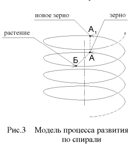 Поэтому классики объединили в своей теории развития цикличность и поступательность первых двух моделей развития. Они отметили, что новые зерна А1, которые даёт растение Б, отличаются от исходных зёрен А своими свойствами: лучшей всхожестью, устойчивостью и т.п., поэтому фактического возврата в исходное состояние в природе не существует. Следовательно, третья модель процесса развития будет выглядеть в виде разрезанной окружности, концы которой не совпадают друг с другом и не образуют кольцо, а находятся один над другим, образуя один виток спирали (винтовой линии, показанной на рис.3).